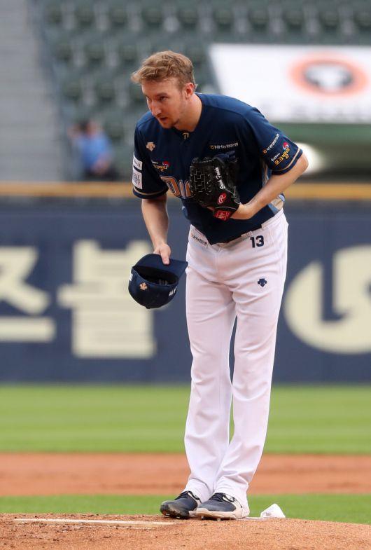 투구에 앞서 관중석을 향해 정중하게 인사를 하는 에릭 페디. 정지윤 선임기자 |