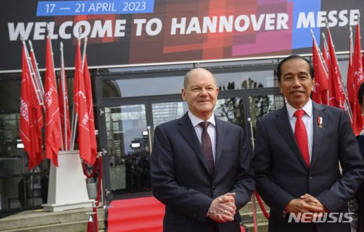 [하노버=AP/뉴시스] 올라프 숄츠(왼쪽) 독일 총리와 조코 위도도 인도네시아 대통령이 16일 일요일 독일 하노버에서 열린 하노버 산업박람회 개막식에 함께 서 있다. 2023.04.17 |