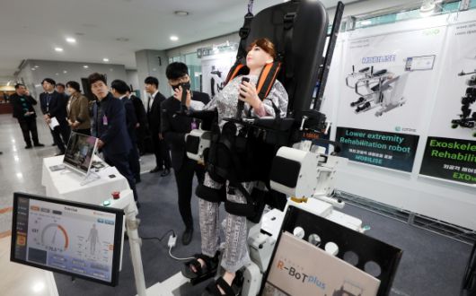 국회 혁신 4.0연구포럼… 재활·의료 로봇 시연 - 6일 서울 여의도 국회 의원회관 로비에서 열린 ‘돌봄 및 사회적 약자를 위한 로봇 전시회’에서 관람객들이 제품을 살펴보고 있다. ‘국회 혁신 4.0 연구포럼’이 주최한 행사에는 재활·의료 로봇업체들이 참여해 로봇을 시연했다. 뉴시스 |