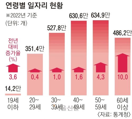 50대 일자리 규모가 처음으로 40대를 제쳤다. 60세 이상 일자리가 1년 새 44만개 늘어날 때 청년층 일자리는 1만 9000개 늘어나는 데 그쳤다. 저출산·고령화 충격파가 노동 시장을 강타한 것이다.