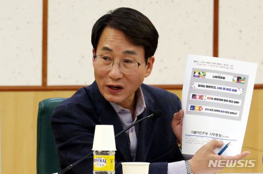 [서울=뉴시스] 조성봉 기자 = 이원욱 더불어민주당 의원이 19일 오후 서울 여의도 국회 의원회관 세미나실에서 열린 ‘원칙과 상식 민심소통: 청년에게 듣는다’ 간담회에서 2023 새로운 민주당 캠페인 현수막 관련 공문을 들어보이고 있다. 2023.11.19. suncho21@newsis.com