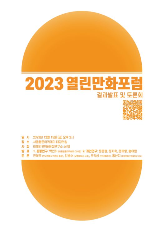 ‘2023 열린만화포럼 결과 발표 및 토론회’에서는 공동연구 및 개인연구 결과를 종합적으로 발표하고 토론하는 시간을 가진다. 이미 부산과 서울에서 공개된 공동연구 '네이버 웹툰의 흥행 요소 분석'은 박인하 서울웹툰아카데미 이사장이 요약 발표하고 문종필, 문지욱, 문채영, 홍여림 등의 개인연구 4건도 처음으로 공개 발표된다.