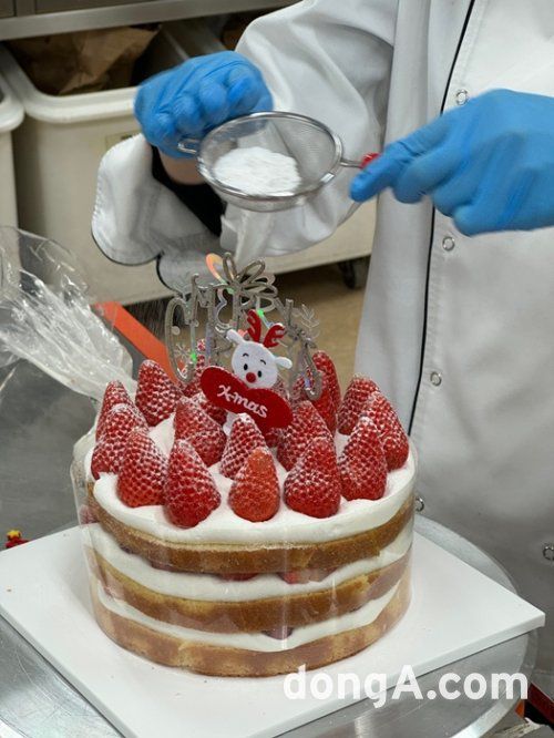신세계푸드 관계자가 7일 기자들을 대상으로 크리스마스 케이크 쿠킹 과정을 시연하고 있는 모습. 사진=윤우열 동아닷컴 기자 cloudancer@donga.com |
