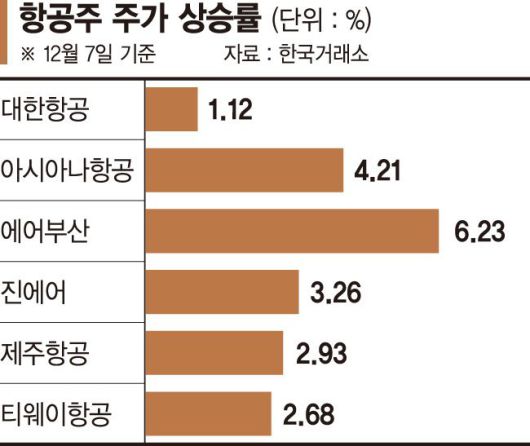 LCC도 일제히 상승했다. 가장 높은 상승률을 보인 건 에어부산이다. 전 거래일 대비 6.23% 오른 2985원에 장을 마쳤다. 이 밖에 진에어(3.26%), 제주항공(2.93%), 티웨이(2.68%) 순으로 오름 폭이 컸다.