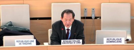 (제네바=연합뉴스) 26일(현지시간) 오후 스위스 소재 유엔 제네바 사무소에서 열린 한국에 대한 국가별 정례 인권검토(UPR) 절차에 참석한 한대성 주제네바 북한 대표부 대사가 발언하고 있다. 2023.1.27 |