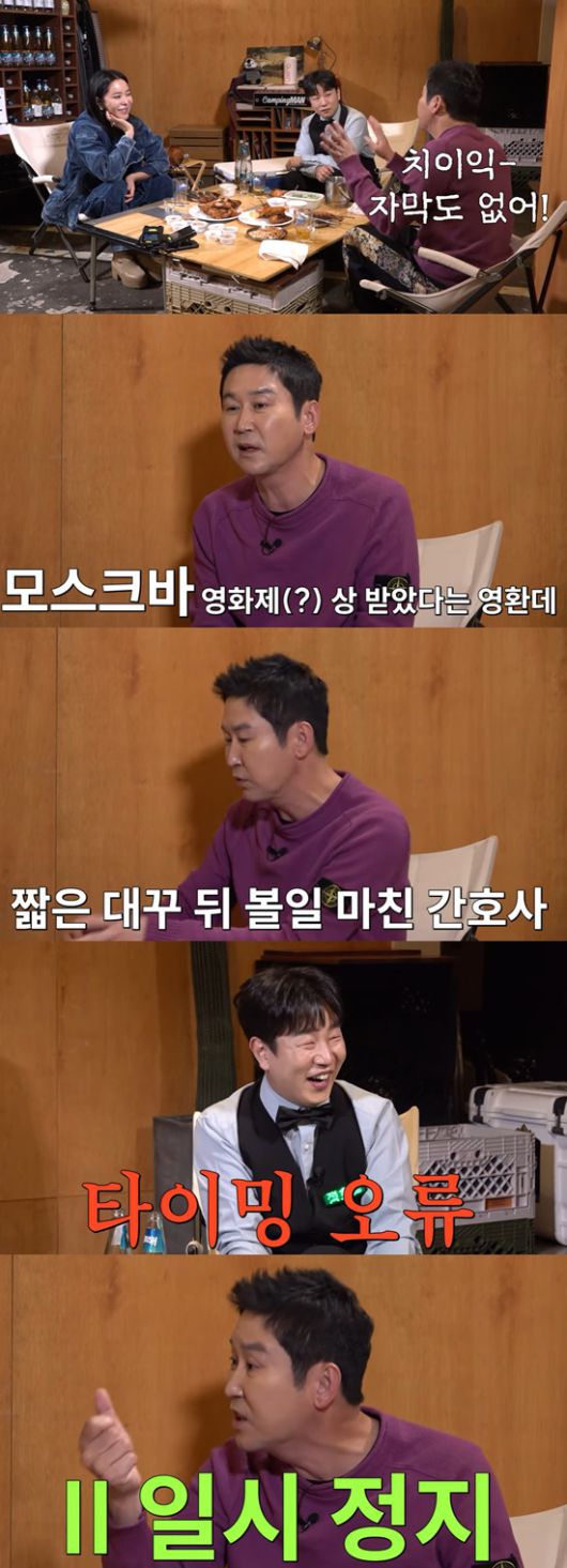 신동엽은 "구멍이 작아서 안 들어간다고 했다. 진짜 간호사가 미X. 그냥 대학생이었다"라며 "그러다 일반 2인실로 가고 한 명이 퇴원해서 혼자 썼다. 아는 형이 제목 없는 비디오를 줬다. 야한 장면이 없어서 그냥 틀어뒀고 간호사가 들어왔다. 모스크바 영화제 상받은 영화라고 했다"고 말해 이후 스토리에 대한 궁금증을 자아냈다.