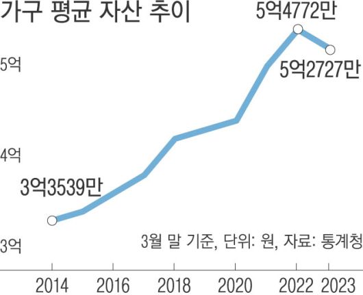 통계청이 7일 발표한 2023년 가계금융복지조사에 따르면 올해 3월 말 기준 가구 평균 자산은 5억2727만원으로 집계돼 전년 대비 3.7%(2045만원) 줄었다. 이 조사가 시작된 2012년 이후 가구 평균 자산이 감소한 것은 올해가 처음이다. 자산을 보유한 가구를 자산 규모에 따라 순서를 매겼을 때 한가운데 있는 가구의 자산 규모는 3억232만원이었다. 이 역시 1년 새 1.5% 감소했다.