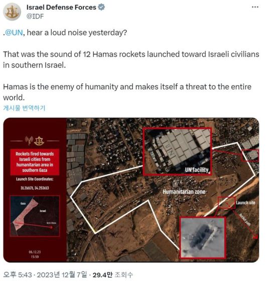 [서울=뉴시스]이스라엘방위군(IDF)은 팔레스타인 무장정파 하마스가 인도주의 구호 활동 지역 등에서 민간인을 향해 로켓을 발사했다고 7일(현지시간) 발표했다. 사진은 IDF 소셜미디어 갈무리. 2023.12.07. |
