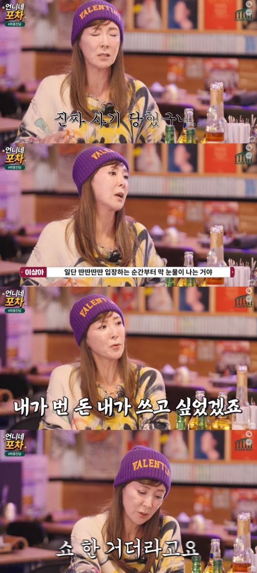 이어 이상아는 첫 번째 이혼 후 1년 만에 재혼을 했다. 그는 "상대가 영화 제작한다고 그랬다. 첫 번째 결혼 상대에게 보란듯이 결혼했고 혼전 임신을 했다. 결혼하고 나서 사기꾼인 것을 알았다"며 "임신하고 남편 빚 사실이 터졌다. 입장하면서 눈물이 났다"고 했다.