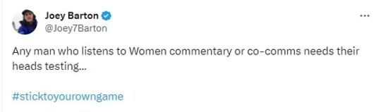 영국 '데일리 메일'은 7일(한국시간) "바튼은 '여자들이 남자 축구에 대해 이야기해선 안 된다'라고 주장한다. 그는 소셜 미디어에 성차별적인 게시글을 올렸다"라고 보도했다.