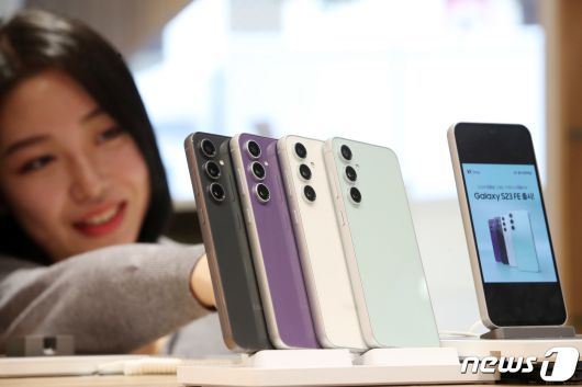 (서울=뉴스1) 이승배 기자 = 8일 서울 종로구 KT플라자에서 모델들이 '갤럭시 S23 FE'를 소개하고 있다. 갤럭시 S23 FE는 민트, 그라파이트, 퍼플, 크림 네 가지 색상으로 출시된다. 스토리지는 256GB이며, 가격은 84만7,000원이다. 전국 삼성스토어와 삼성닷컴, 이동통신사 온∙오프라인 매장과 오픈마켓 등에서 구매할 수 있다. 2023.12.8/뉴스1