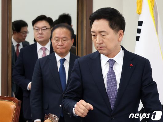 국민의힘 김기현대표와 윤재옥 원내대표가 30일 오전 서울 여의도 국회에서 열린 최고위원회의에 참석하고 있다. 2023.11.30/뉴스1 ⓒ News1 황기선 기자 |