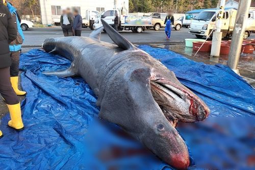 8일 포항해양경찰서 등에 따르면, 이날 오전 포항시 남구 장기면 앞바다에서 한 어선 선장이 정치망 그물에 걸려 죽은 돌묵상어를 발견했다. [사진출처=연합뉴스] |
