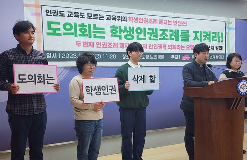 이어 "본회의에서 폐지안이 통과하면 충남은 전국에서 최초로 학생인권조례가 폐지된 지역이자 전국에서 유일하게 인권조례가 두 번 폐지된 지역이라는 오명을 쓴다"며 "혐오 세력을 위해 충남 학생 전체 인권을 저울질하려는 도의회 행태를 도민들은 절대 좌시하지 않을 것"이라고 규탄했다.