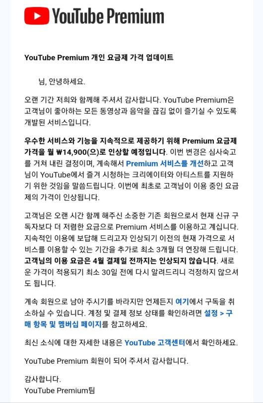 이번 가격 인상은 이날부터 유튜브 프리미엄 멤버십에 가입하는 신규 회원들을 대상으로 우선적으로 진행될 예정이다. 기존 가입자들에게는 가격 인상이 적용되기 30일 전 공지 메일을 통해 새로운 가격에 동의를 받는다. 가입자 별로 인상 시점이 다를 수 있어 메일은 순차적으로 발송될 예정이다. 가격에 동의하지 않으면 멤버십은 자동으로 종료된다.