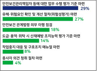 중대재해처벌법 의무사항 중 준비가 어려운 항목으로는 △안전보건관리책임자 등에 대한 업무 수행 평가 기준 마련(29%) △유해·위험요인 확인 및 개선 절차(위험성평가) 마련(27%) △안전보건 관계법령 의무 이행 점검(18%) △도급·용약 위탁 시 산재예방 조치능력 평가 기준 마련 등의 순으로 꼽았다.