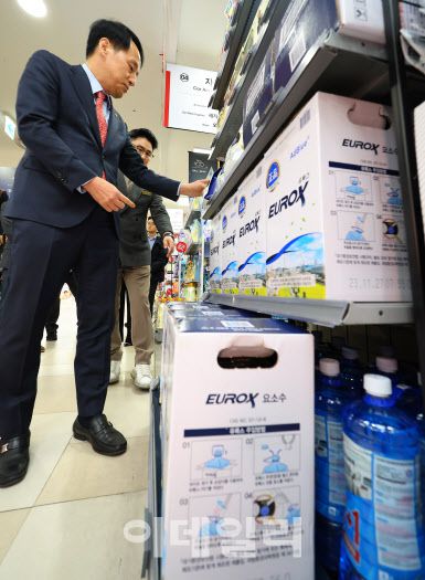 [이데일리 김태형 기자] 장영진(왼쪽) 산업통상자원부 제1차관이 지난 6일 서울 신천동 롯데마트 월드타워점에서 요소수 재고 및 판매 상황을 체크하고 있다. |