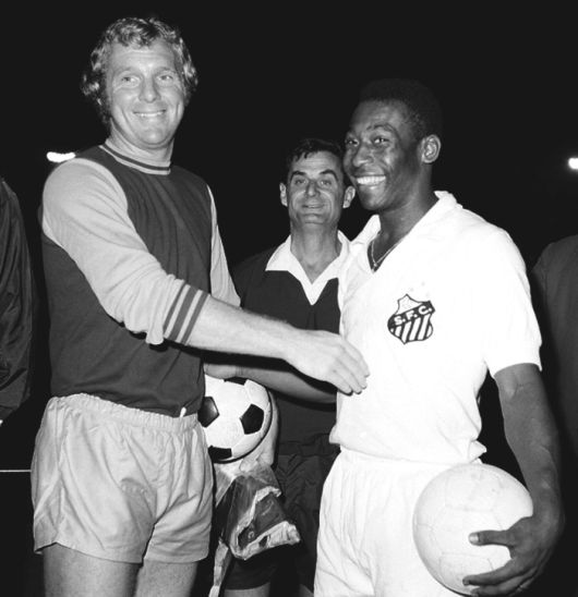 산투스 시절의 ‘축구황제’ 펠레(오른쪽)가 지난 1970년 멕시코에서 열린 축구경기에 앞서 잉글랜드의 보비 무어와 악수를 하고 있다. AP 연합뉴스 |