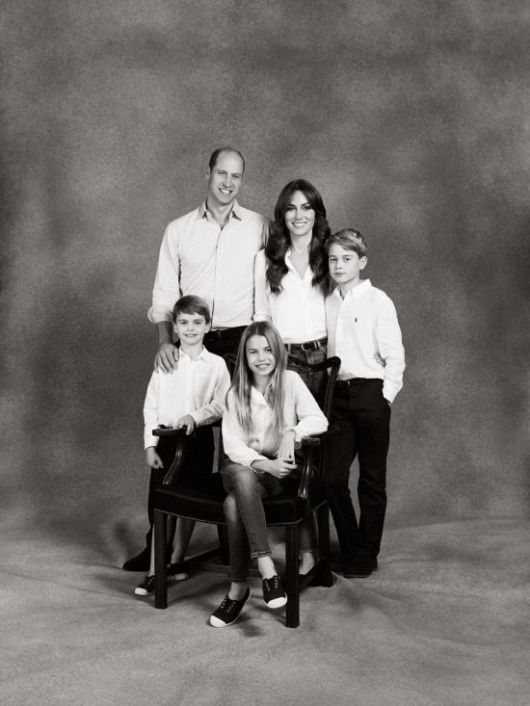 9일(현지시간) 켄싱턴궁이 공개한 가족사진에서 왕위 서열 2위인 윌리엄 왕세자와 케이트 미들턴 왕세자빈 부부는 세 자녀와 함께 넥타이 없는 흰 셔츠에 청바지 차림을 맞춰 입고 자연스럽게 미소 짓고 있다.