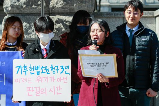 박지혜 변호사가 13일 서울 종로구 헌법재판소 앞에서 열린 청소년기후행동 ‘기후 헌법소원 청구 3년, 더 이상 미룰 수 없다 : 이제는 위기가 아닌 판결의 시간’ 기자회견에서 지지발언을 하고 있다. 2023.3.13. 뉴스1 |