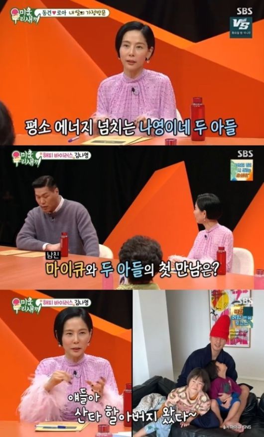 이날 방송에서 김나영은 아들들과 마이큐의 첫 만남을 언급하며 "크리스마스 이브에 만났다. 아이들이 굉장히 좋아할 것이라고 기대를 했었는데 생각만큼 그렇게 좋아하지 않더라. 산타할아버지가 가짜인 것이 티가 났었다"고 웃었다.