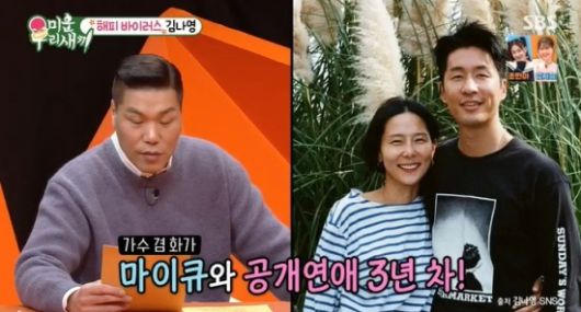 이날 MC 서장훈은 김나영을 소개하며 "(김)나영 씨가 여러 가지 아픔을 딛고 새 사랑을 찾은 희망의 아이콘이다. 가수 겸 화가 마이큐 씨와 공개연애 3년 차다. 김나영 씨가 마이큐 씨 팬이었다고 하더라"고 말했다.