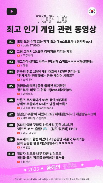 채널 ootb STUDIO의 ‘전과자’ 시리즈 중 < 오전 수업 없는 학과 [오산대 e스포츠과]>가 1위, 연예계 철권 고수로 알려진 남규리가 출연한 <철권신 ‘무릎’이 져줬다고요? 재대결합니다. | 게임광규리 1화>가 7위, 르세라핌 멤버 사쿠라와 프로게이머 데프트가 함께 ‘리그 오브 레전드’를 플레이한 <실버 꾸라도 하드캐리(?)한 세.체.원 ‘데프트 버스’ 출발! │ [겁도 없꾸라] EP.07> 영상이 8위를 차지했다.