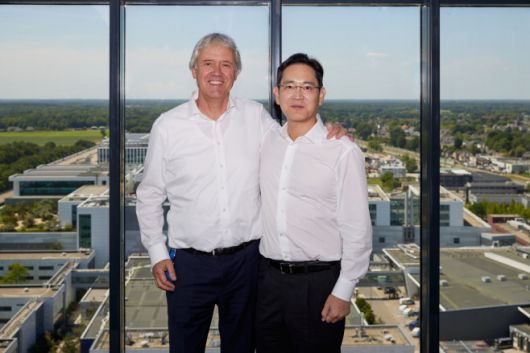 이재용 삼성전자 회장(오른쪽)과 페터르 베닝크 ASML CEO가 2022년 6월 ASML 본사에서 만나 기념 촬영하고 있다. /삼성전자 |