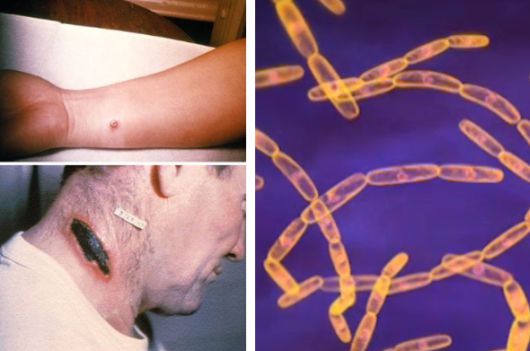 피부 탄저병은 무통증의 가려운 적갈색 돌기로 시작된다. 그 후 돌기는 물집을 형성하고 물집이 터져 검정색 괴사 딱지를 생성한다. 오른쪽은 탄저균/이미지=미국 질병통제예방센터(CDC) |
