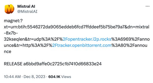 한편 미스트랄 AI는 별도의 보도자료 배포나 공개 행사 없이 X(트위터)를 통해 토렌트 다운로드 링크만 공개하는 방식으로 모델을 배포했다. 최근 논란이 된 구글의 '제미나이나' 발표나 오픈AI의 'GPT-4 터보' 출시 행사와는 대조를 이뤘다.