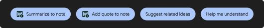 또 원본 문서에서 정보를 더 쉽게 추출할 수 있다. 사용자가 노트북LM에 업로드된 문서나 웹페이지의 특정 구절을 선택하면 내장된 챗봇이 자동으로 해당 내용을 새로운 노트로 요약하고 기술 언어 또는 복잡한 아이디어를 이해하는 데 도움을 준다. 메모를 작성하는 동안 AI는 문장을 다듬거나 다듬을 수 있는 도구를 제공하거나 방금 작성한 내용을 기반으로 소스에서 관련 아이디어를 제안한다.