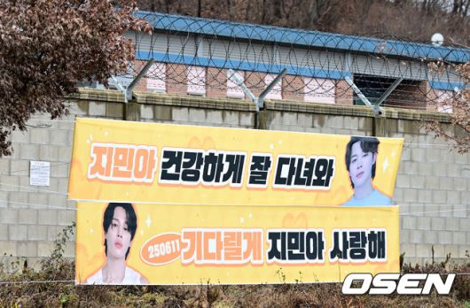 [OSEN=지형준 기자] 그룹 방탄소년단(BTS) 지민, 정국이 12일 경기도 연천 5사단 신병교육대에 동반 입대한다. 어제(11일) 뷔와 RM에 이어 지민과 정국이 입대하면 방탄소년단 모든 멤버가 국방의 의무를 다하게 된다. 신병교육대 앞에 BTS 지민의 군 생활을 응원하는 현수막이 걸려 있다. 2023.12.12 / jpnews.osen.co.kr
