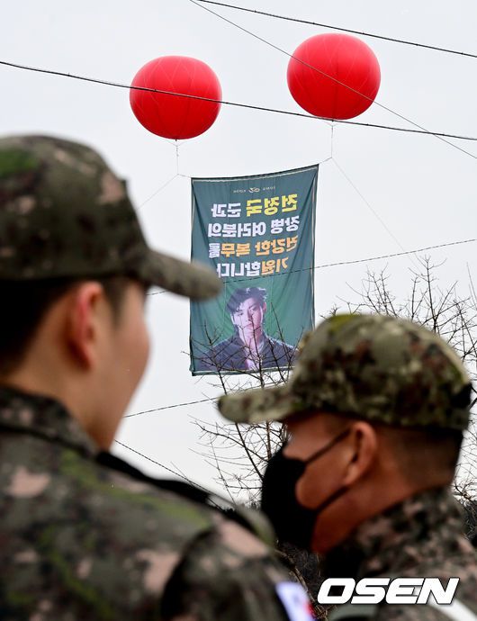[OSEN=지형준 기자] 그룹 방탄소년단(BTS) 지민, 정국이 12일 경기도 연천 5사단 신병교육대에 동반 입대한다. 어제(11일) 뷔와 RM에 이어 지민과 정국이 입대하면 방탄소년단 모든 멤버가 국방의 의무를 다하게 된다. 신병교육대 앞에 BTS 정국의 군 생활을 응원하는 애드벌룬이 띄워져 있다. 2023.12.12 / jpnews.osen.co.kr