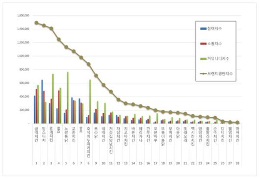 브랜드에 대한 평판분석은 브랜드에 대한 소비자 빅데이터를 수집하여 브랜드에 영향을 끼치는 참여가치, 소통가치, 소셜가치, 시장가치, 재무가치로 분석 된다. 치킨 브랜드 평판조사에서는 참여지수와 소통지수, 커뮤니티지수로 분석했다.