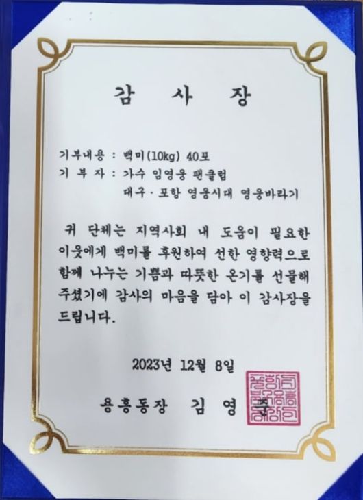 임영웅 팬클럽에서 2023년 연말을 맞아 대구,포항 영웅시대 영웅바라기 회원들이 지역에 소외되고 어려운 이웃들의 도움이 되길 바라는 마음에 기부에 동참했다.