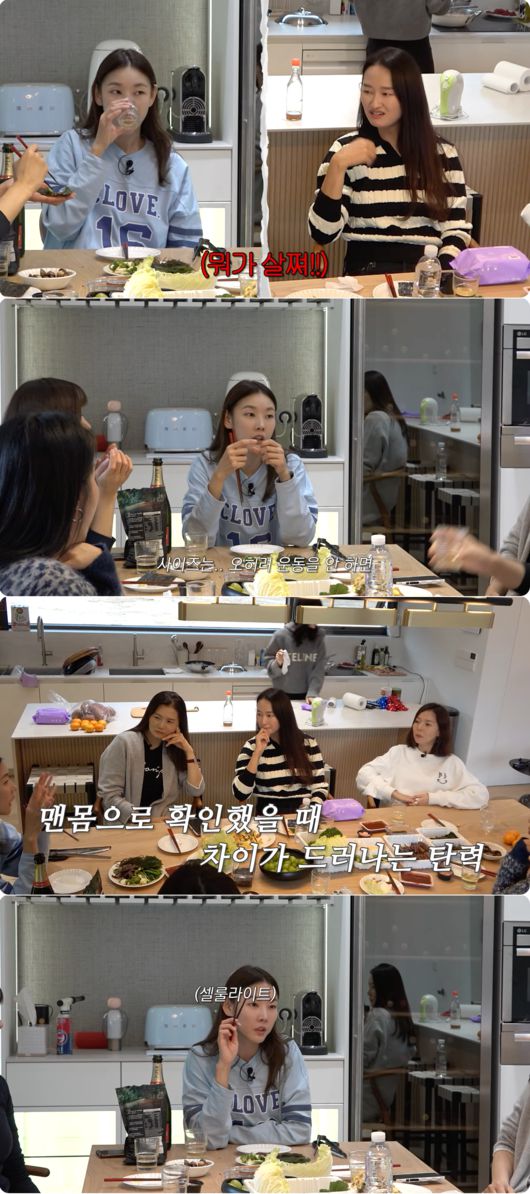 이어 한혜진은 “나는 모델이 직업이니까 어쩔 수 없다. 사이즈는 오히려 운동을 안하면 (준다) 벗고보면 살이 흐물흐물해지고 탄력이 1도 없어. 셀룰라이트가 심해진다”라고 말했다 한혜진은 “엉덩이를 기준으로 셀룰라이트가 점점 내려와”라고 덧붙였다.