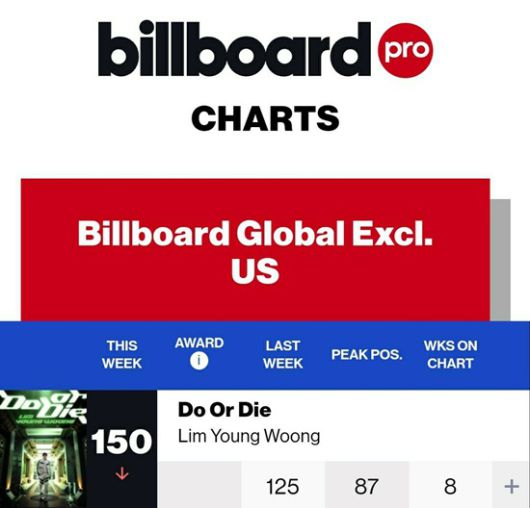 임영웅의 'Do or Die'는 지난 12일 미국 빌보드가 발표한(2023년 12월 12일 자) 글로벌(미국 제외) 차트에서 전주 대비 25계단 하락한 150위에 오르면서 8회 연속 차트인했다.