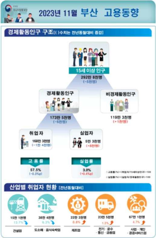 13일 동남지방통계청의 ‘2023년 11월 부산시 고용동향’ 자료에 따르면 올해 11월 취업자는 지난해보다 1만4000명, 0.8% 줄어든 168만3000명으로 나타났다.