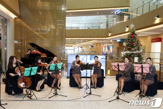 (서울=뉴스1) = 아시아나항공 캐빈 챔버 앙상블이 13일 서울 강서구 이대서울병원에서 환자를 위한 연주회를 하고 있다. (아시아나항공 제공) 2023.12.13/뉴스1photo@news1.krCopyright ⓒ 뉴스1. All rights reserved. 무단 전재 및 재배포, AI학습 이용 금지.
