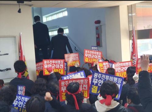'광주전투비행장 무안이전 반대 범군민대책위원회' 소속 주민들은 이날 오전부터 무안군청 1층 로비를 점거한 채 김산 무안군수의 '도민의 대화' 불참을 요구하고 있다.