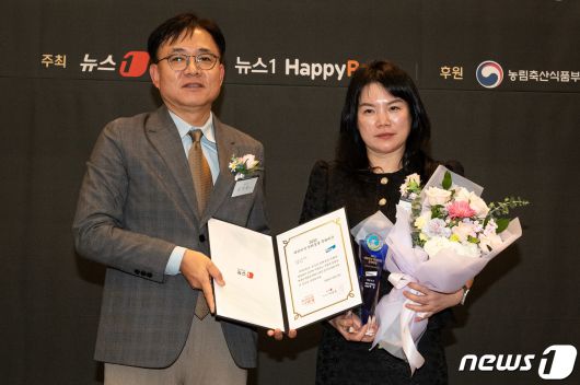 (서울=뉴스1) 유승관 기자 = 한국엘랑코동물약품 정현진 대표가 13일 서울 중구 프레스센터에서 뉴스1 주최로 열린 '2023 대한민국 반려동물 문화대상'에서 국회 환경노동위원회 위원장상 '동물 건강·환경 부문 대상'을 수상한 후 김기성 뉴스1 전무이사와 기념 촬영을 하고 있다. 2023.12.13/뉴스1