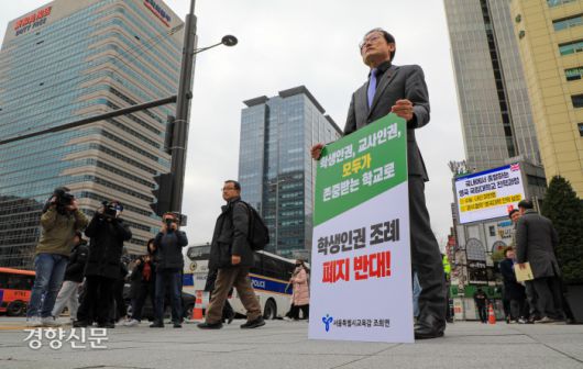 조희연 서울시교육감이 13일부터 8일간 서울 전역을 돌며 학생인권조례 폐지에 반대하는 1인 시위를 한다. 조 교육감은 이날 1인 시위 시작에 앞서 서울 광화문광장에서 기자회견을 열고 “부족한 학교현실이 학생인권조례 때문이라고 서둘러 규정하는 단순 논리로 학생인권조례를 폐지하자는 것은 부적합하다”며 “일각에선 최근 잇따른 악성민원, 교육활동 침해 등을 학생인권조례만의 탓으로 돌리는 주장이 나오지만, 결코 동의할 수 없다”고 말했다.