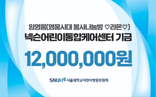 최은화 서울대어린이병원장은 “중증 어린이·청소년 환자와 가족들에게 보내주신 따스한 관심에 감사드린다”며 “임영웅씨와 영웅시대 라온의 선한 뜻이 어린이 환자와 가족들에게 잘 전달될 수 있도록 후원금을 소중히 사용하겠다”고 했다.