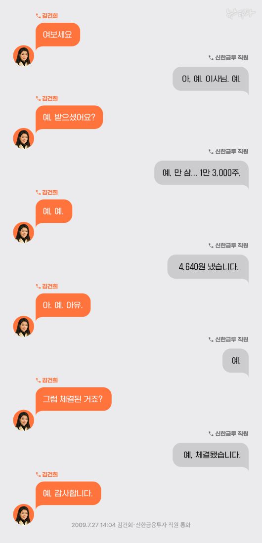 김건희 여사와 신한금융투자 직원 사이 통화 내용 그리고 이 직원의 진술조서를 종합해 2009년 7월 27일의 상황을 재구성해보면 이렇다.