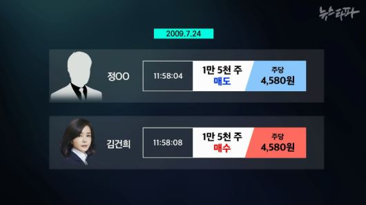 그로부터 4초 뒤인 11시 58분 8초, 김건희 여사 계좌에서 똑같이 15,000주를 4,580원씩에 사겠다는 주문이 나왔다.