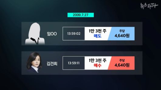 임 씨의 매도 주문 불과 9초 뒤인 오후 1시 59분 11초, 김건희 여사의 신한금융투자 계좌에서 정확히 같은 가격과 같은 물량의 매수 주문이 나왔다.