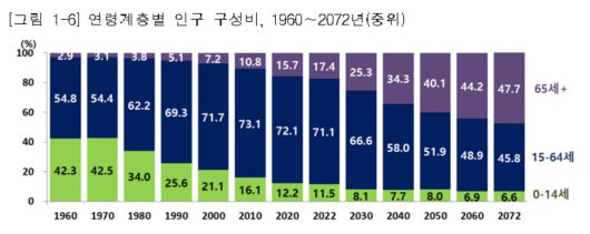 출산율과 기대수명, 국제순이동 지표를 긍정적으로 높게 가정(고위추계)한다고 해도 2072년 중위 연령은 60.8세로 예상됐다.