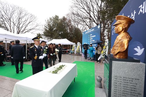 (수원=연합뉴스) 김솔 기자 = 경기남부경찰청은 14일 충북 충주 중앙경찰학교 충의선양탑에서 '올해의 경찰 영웅'으로 선정된 고(故) 이강석 경정을 기리는 흉상 제막식을 개최했다고 밝혔다.