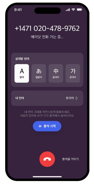아이폰에서 SK텔레콤의 인공지능(AI) 비서 ‘에이닷’ 애플리케이션(앱)을 켰다. 해당 앱의 전화 기능을 이용해 상대방에게 연락한 뒤 휴대전화 연결음이 들리는 사이 ‘통역콜’ 버튼을 눌렀다. 스크린 터치를 통해 상대방 언어는 ‘영어’로, 내 언어는 ‘한국어’로 선택했다. 상대편이 전화를 받자 영어로 “잠시만요, 지금부터 통역을 위해 통화 내용이 번역기로 전달됩니다”라는 음성 안내가 나왔다.