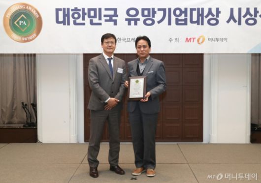 대양코스 이병효 대표(오른쪽)가 '2023 대한민국 유망기업대상' 수상 후 머니투데이 송기용 전무(왼쪽)와 기념 촬영을 하고 있다./사진=이기범 기자 leekb@ |
